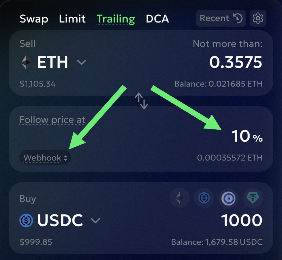 When the webhook is received, the order starts trailing 10% below the price — and will sell if ETH falls by that amount after the webhook trigger.