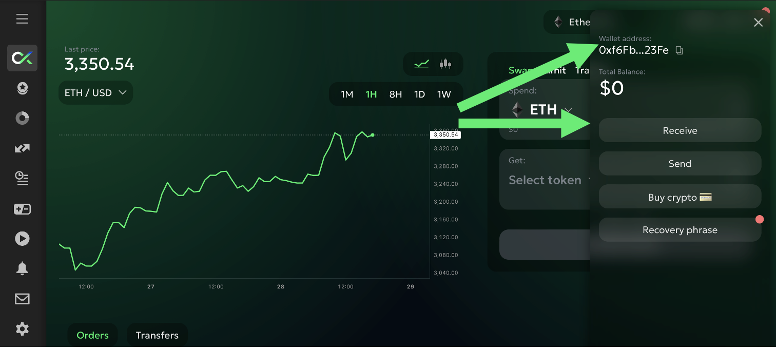 لكشف عنوان الاستلام الكامل الخاص بك، اضغط على العنوان القصير في تبويب المحفظة أو استخدم `استلام` الزر: