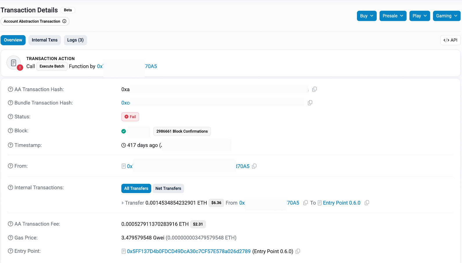 * في حالتنا، وبما أن هذه معاملة قديمة (منذ أكثر من 400 يوم)، كانت SCWs لا تزال نادرة واحتوت الحزمة على UserOp الخاص بنا فقط — ولهذا يظهر التبويب “معاملات AA (1).” في المعاملات الأحدث، ستشهد غالبًا عدة UserOps مجمعة معًا في حزمة واحدة.