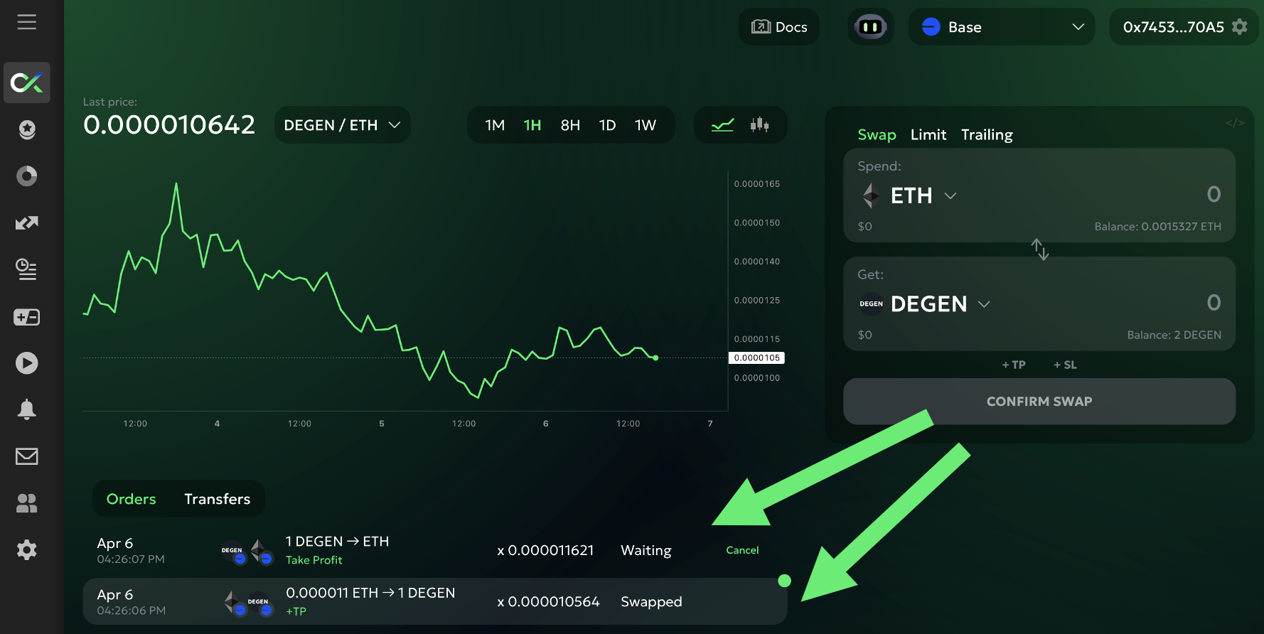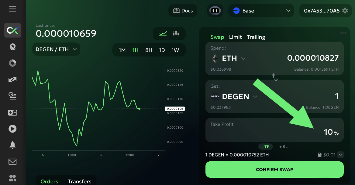 Puedes ver que compré 1 DEGEN en Base a 0.000010564 ETH, y el sistema colocó una orden Take Profit para vender 1 DEGEN un 10% más alto (a 0.000011621 ETH).