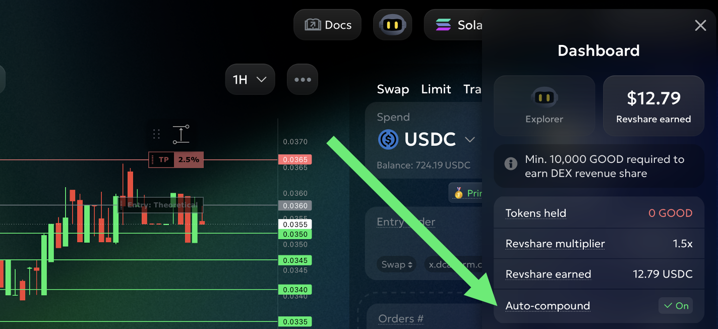 Par défaut, votre part de revenus sera automatiquement réinvestie en jetons GOOD, vous permettant de **auto-composer** vos avoirs. À moins que vous ne le désactiviez, nous utiliserons votre part de revenus pour acheter des GOOD sur le marché. Vous pouvez activer ou désactiver le réinvestissement à tout moment dans votre tableau de bord.
