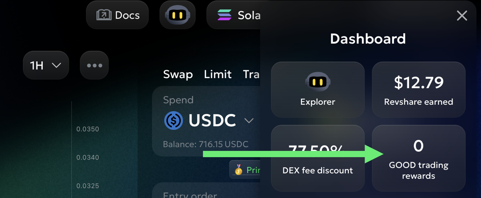 DEX Spot (jeton GOOD) : `+1` bonus GOOD par `$100` traded (c.-à-d., `2` GOOD total pour chaque `$100` de GOOD échangé)