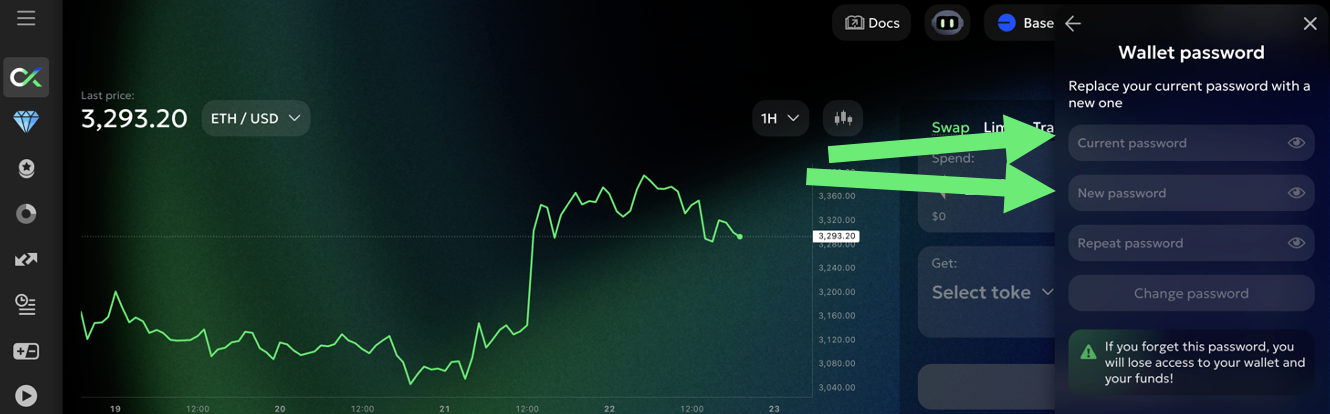 Anda dapat mengubah `kata sandi dompet` kapan saja - cukup klik 'Ubah kata sandi' di tab dompet. Anda akan diminta untuk memasukkan `kata sandi dompet` saat ini dan menetapkan yang baru: