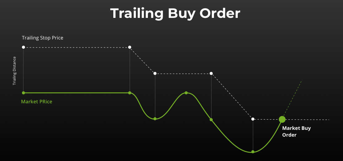 * Trailing Buy segue il prezzo verso il basso e si attiva quando il mercato rimbalza verso l'alto della distanza trailing. Viene tipicamente usato per entrare in una posizione al punto più basso possibile.