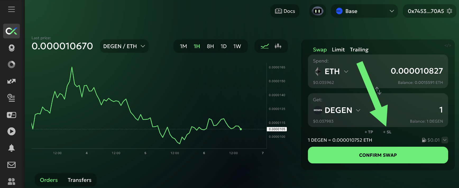 Puoi vedere che ho comprato 1 DEGEN su Base a 0.000010770 ETH e il sistema ha piazzato un ordine Stop Loss per vendere 1 DEGEN al 5% in meno (a 0.000010231 ETH).