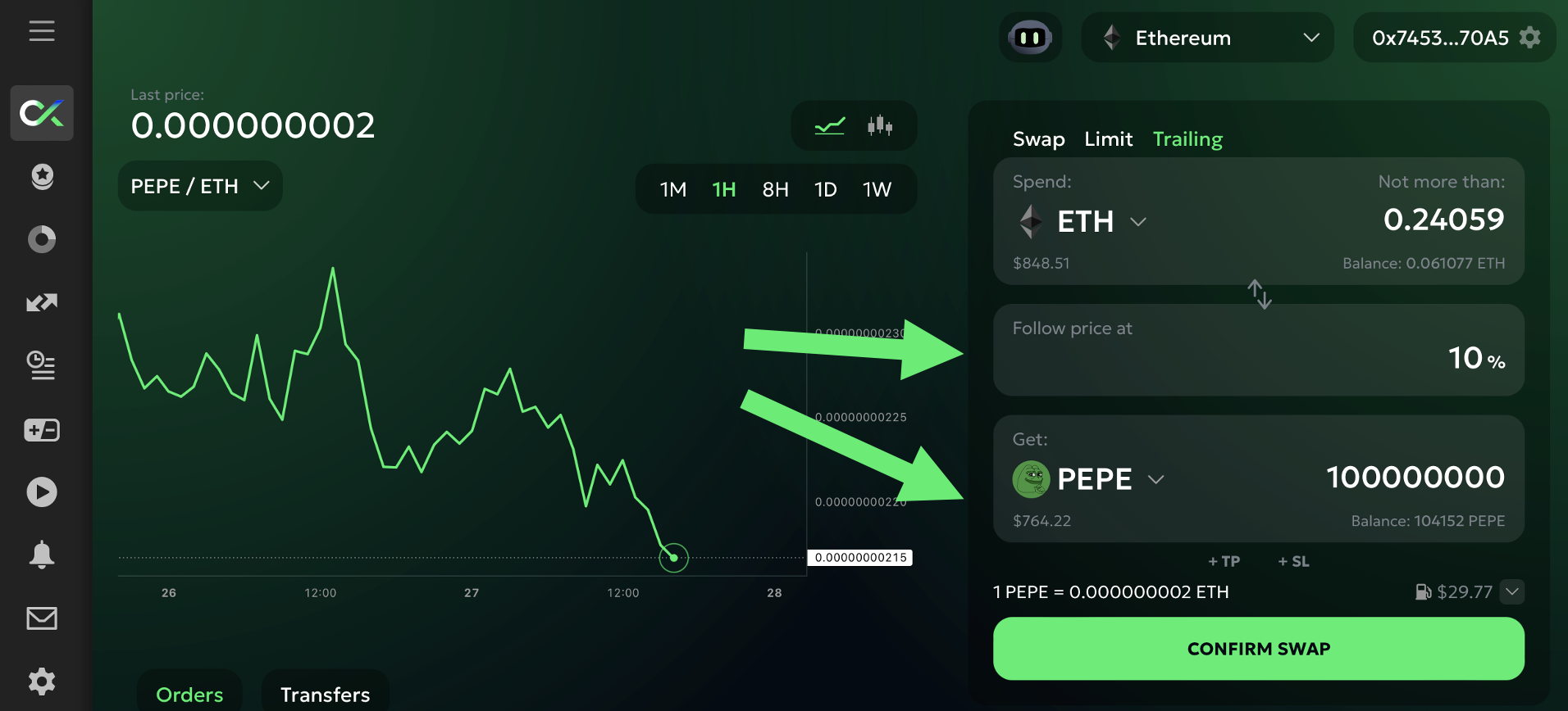 In questo esempio sto comprando 100m PEPE con una distanza di follow del 10%. Ciò significa che il mio ordine sarà inizialmente posizionato al 10% sopra il prezzo di mercato attuale. Se il prezzo scende (PEPE diventa più economico), l'ordine si sposterà automaticamente più in basso (per mantenerlo al 10% dal nuovo prezzo di mercato, più basso).