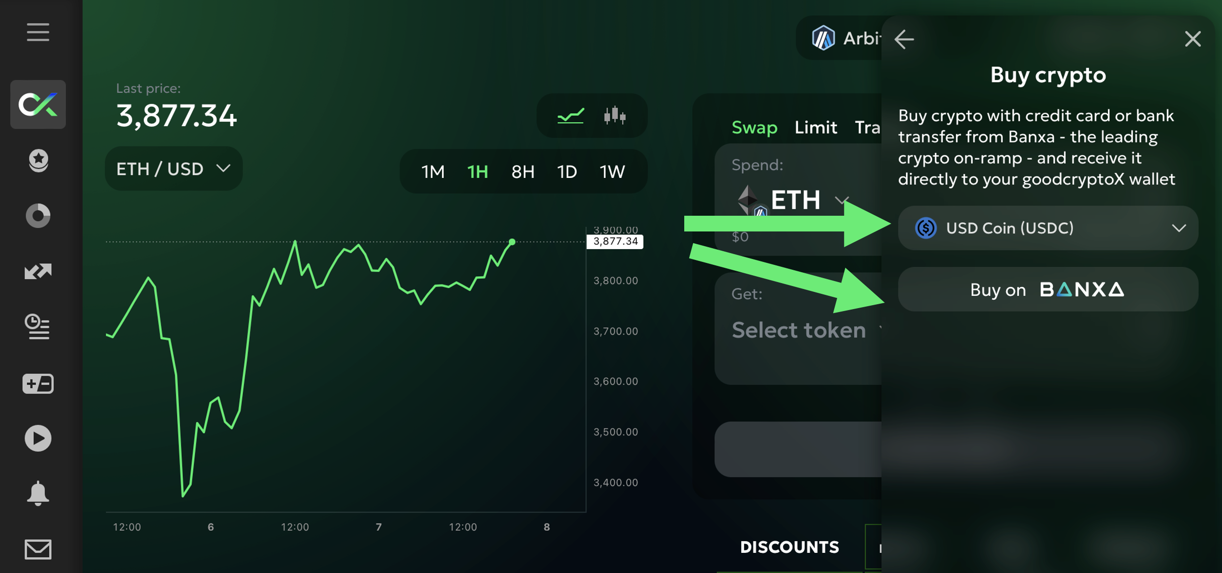 Ви можете купити **SOL, ETH, USDT, USDC**, та багато інших токенів безпосередньо у ваш гаманець goodcryptoX на Solana, Ethereum, Base, BSC або Arbitrum — використовуючи кредитну картку або банківський рахунок.&#x20;